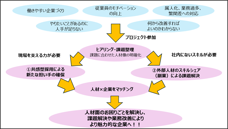 従来からの雇用や外注などの方法に加え、地域内外の副業人材を活用することにより、低コストで、異業種や他社の先進的なノウハウを取り入れ、業務改革や課題解決にチャレンジできます。スキルシェアを入り口として、新たなアイディア・サービスの創出や雇用、経営参画などの可能性にも繋がります。